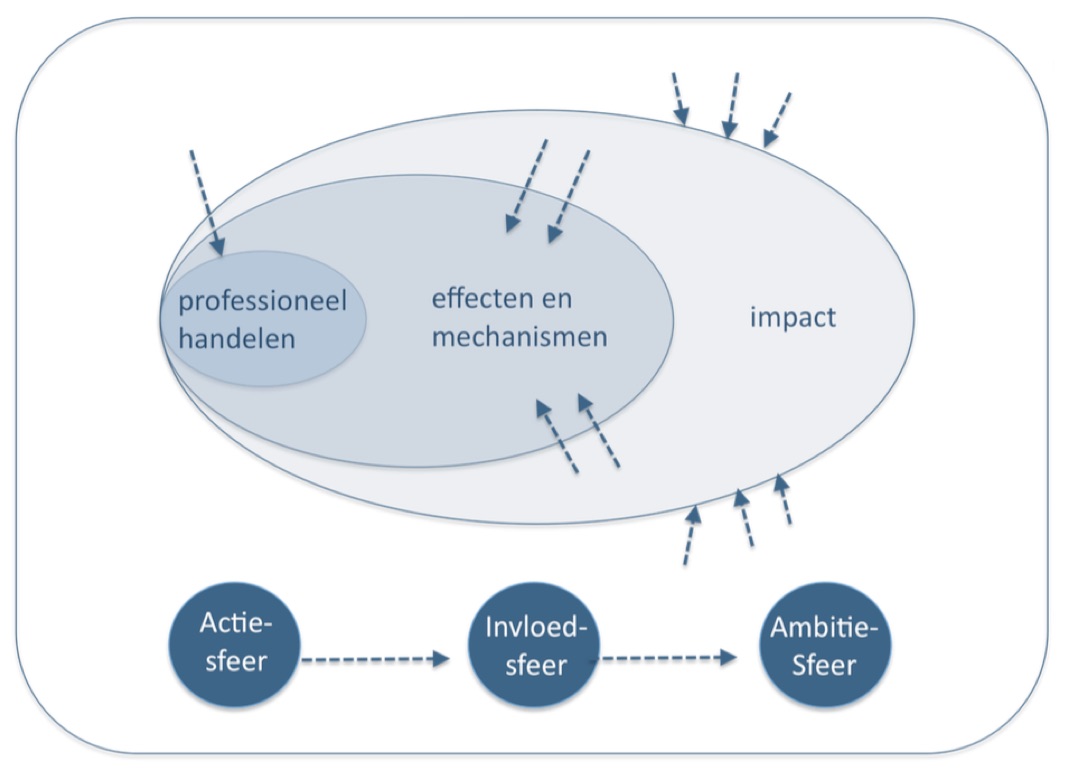 Onderstaand model maakt een onderscheid tussen deze drie sferen van professioneel handelen: de concrete acties die je als professional onderneemt (actiesfeer), de invloed die je met deze acties wilt uitoefenen (invloedsfeer) en de uiteindelijke ambitie van dit alles (ambitiesfeer).